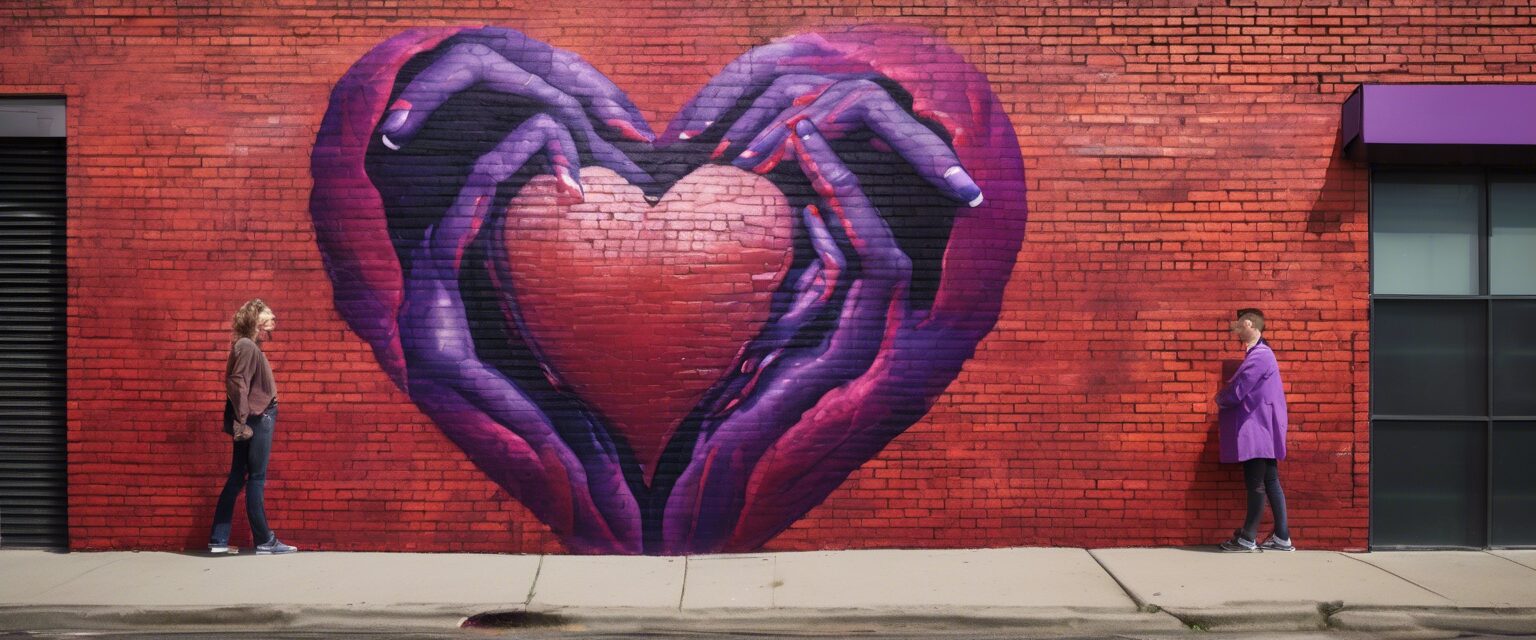 “El mural ‘Amor Urbano: Latidos en la Ciudad’, en una pared de ladrillo, ilustra cómo el amor, representado por un corazón palpitante, es sostenido, cuidado y nutrido por nosotros hasta en los rincones más agitados de la ciudad.”