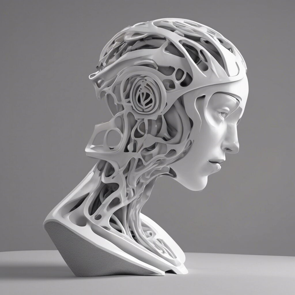 “Una escultura digital 3D minimalista que representa con suavidad y elegancia la confluencia de los humanos y los cyborgs. Suavidad orgánica contrastada con tonos claros y fríos para reflejar el hilo común de este futuro inevitable.”