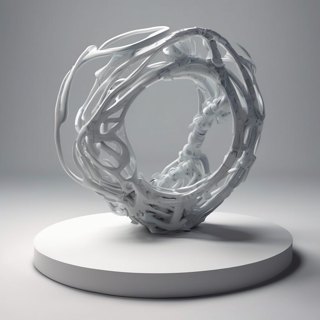 Un delicado equilibrio entre biología y tecnología, donde los nervios de carne y sangre dan paso a los circuitos de metal, mezclándose en una danza de formas orgánicas y artificialidad, explorando la integración cada vez mayor de la tecnología en la forma humana.