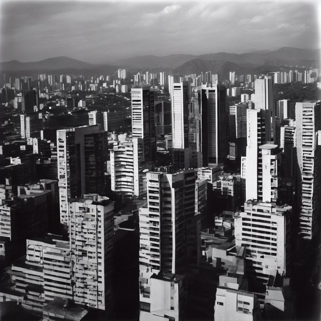 Rascacielos futuristas mosáicos en el paisaje urbano de la Venezuela de hoy, capturados con el intemporal encanto del negativo de vidrio en blanco y negro. Un homenaje al pasado y una mirada al futuro, una fusión de lo antiguo y lo nuevo, una revelación de la resistente alma cultural de Venezuela.