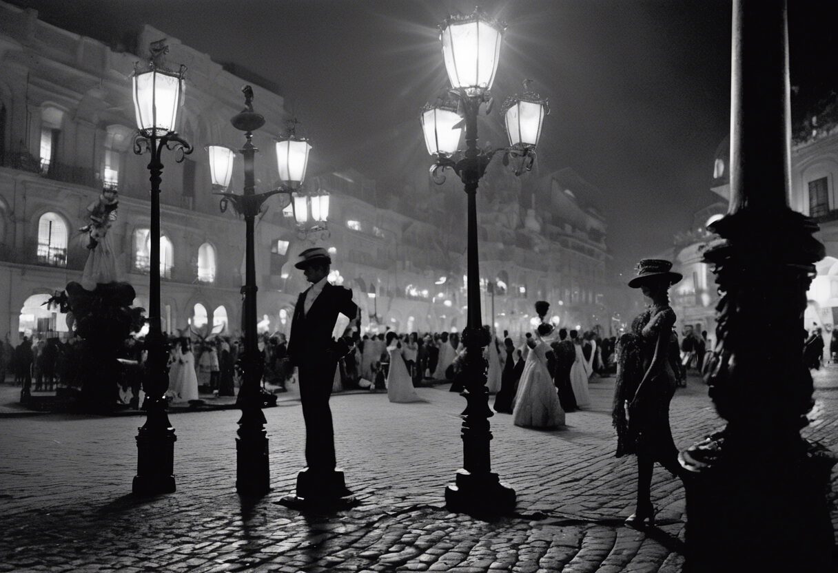 En esta imagen en blanco y negro, la plaza central de Caracas cobra vida con un desfile de alta costura bajo la etérea luz de la luna. Se percibe la elegancia de la época victoriana en cada detalle, inmortalizando un momento de la historia de Venezuela.