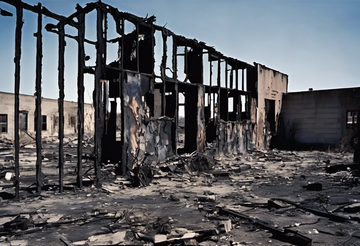 La fotografía captura de manera impactante el paisaje después de la guerra, logrando un retrato conmovedor de la destrucción y la supervivencia. Los rasgos oximorónicos de la imagen, reflejados en los edificios carbonizados y la vida vibrante, son destacados por la técnica analógica y la saturación parcial de los colores. La imagen es un recordatorio del impresionante poder de la resistencia humana, incluso en medio de la devastación más grande.