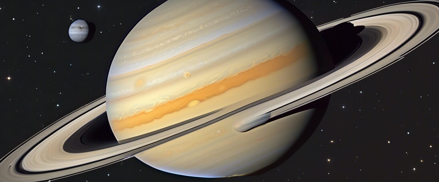 Una joya de la creación celestial, Saturno se posa con maestría en su inconfundible danza alrededor del sol. Sus anillos, como gramófonos del espacio, recitan en silencio la eterna canción del universo.
