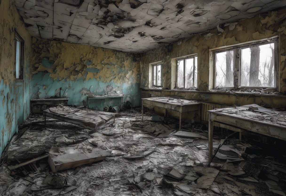 La fotografía captura la desolación de Chernobyl, evidenciando el drama de un desastre nuclear que ocurrió en Europa del Este. La imagen utiliza colores fríos para resaltar la quietud y la falta de vida en el área, denotando el inmenso costo social que supuso el mal uso del poder. A través de estos elementos, la fotografía busca ser un recordatorio del impacto duradero del desastre de Chernobyl y los efectos perjudiciales de la política y el poder desmedido.