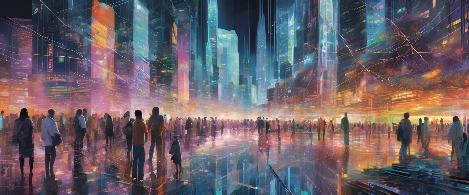 Una metrópoli futurista rica en detalles de alta resolución cobran vida en la relación armoniosa entre seres humanos mejorados, la tecnología avanzada, y las leyes de la gobernanza de Internet y legislación digital.