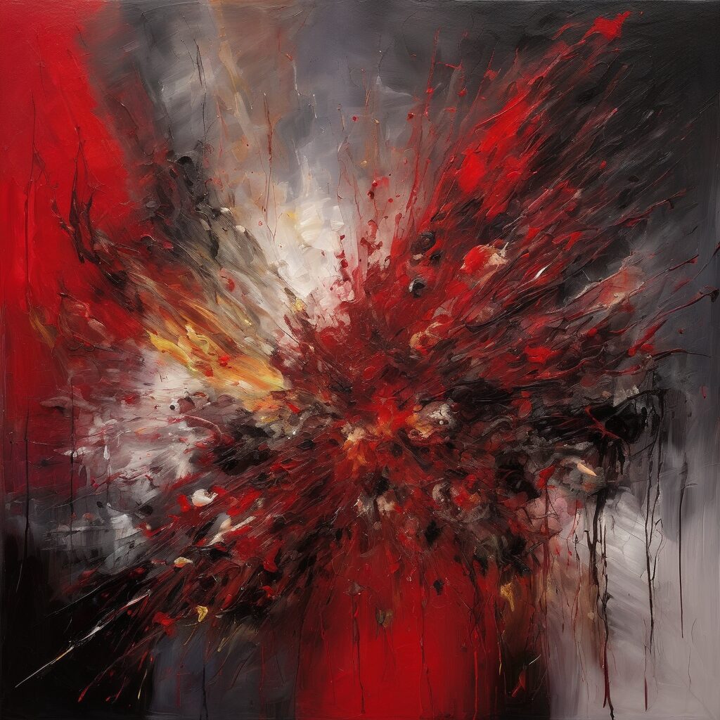 Esta pintura vibrante y abstracta, de la pintora de renombre Berta, es una representación poderosa y colorida del concepto de ‘La muerte’. Con tonos rojos y naranjas vivos que simbolizan la vida en contrapunto con los tranquilos azules y púrpuras que representan lo eterno, esta obra sirve como recordatorio visual de que la muerte es, en realidad, una parte integral y sutilmente hermosa de nuestra existencia.