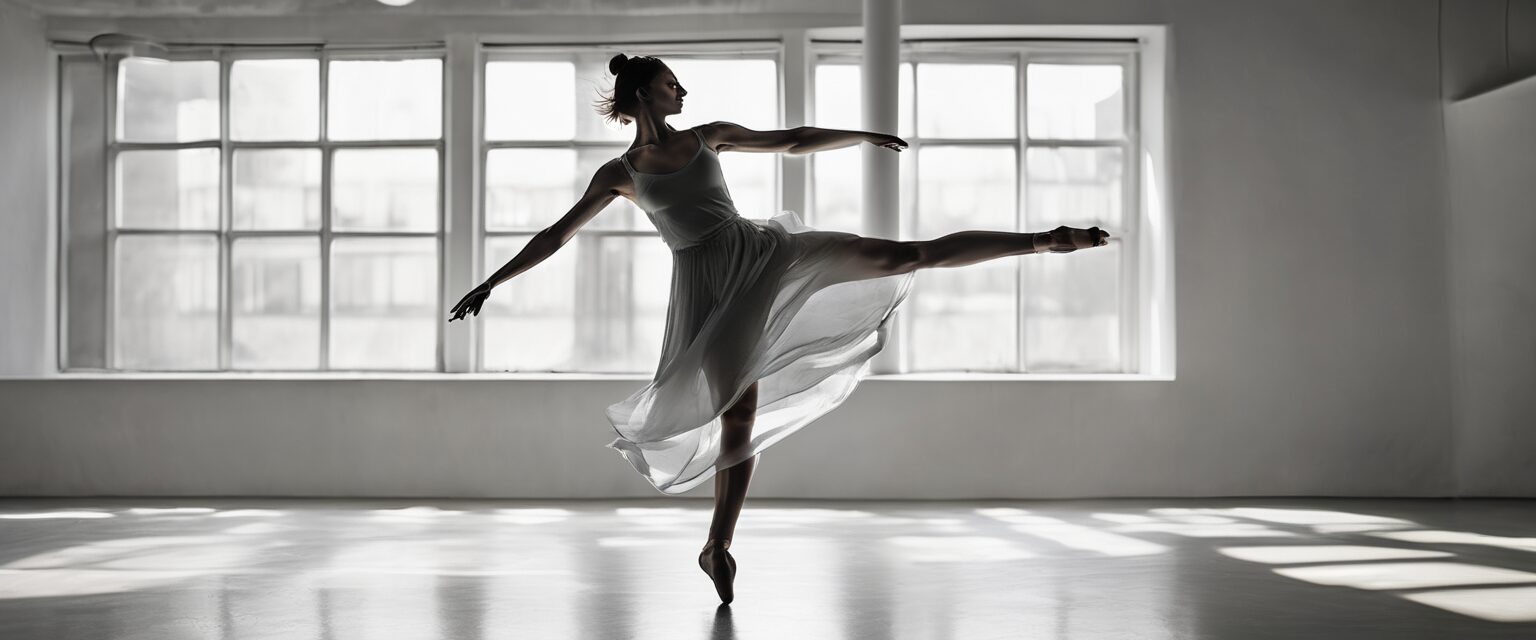 La bailarina, en la cúspide del movimiento, captura la esencia de la danza contemporánea contra un telón de escenario minimalista, encarnando un contraste fascinante entre fuerza y tranquilidad, movimiento y quietud.
