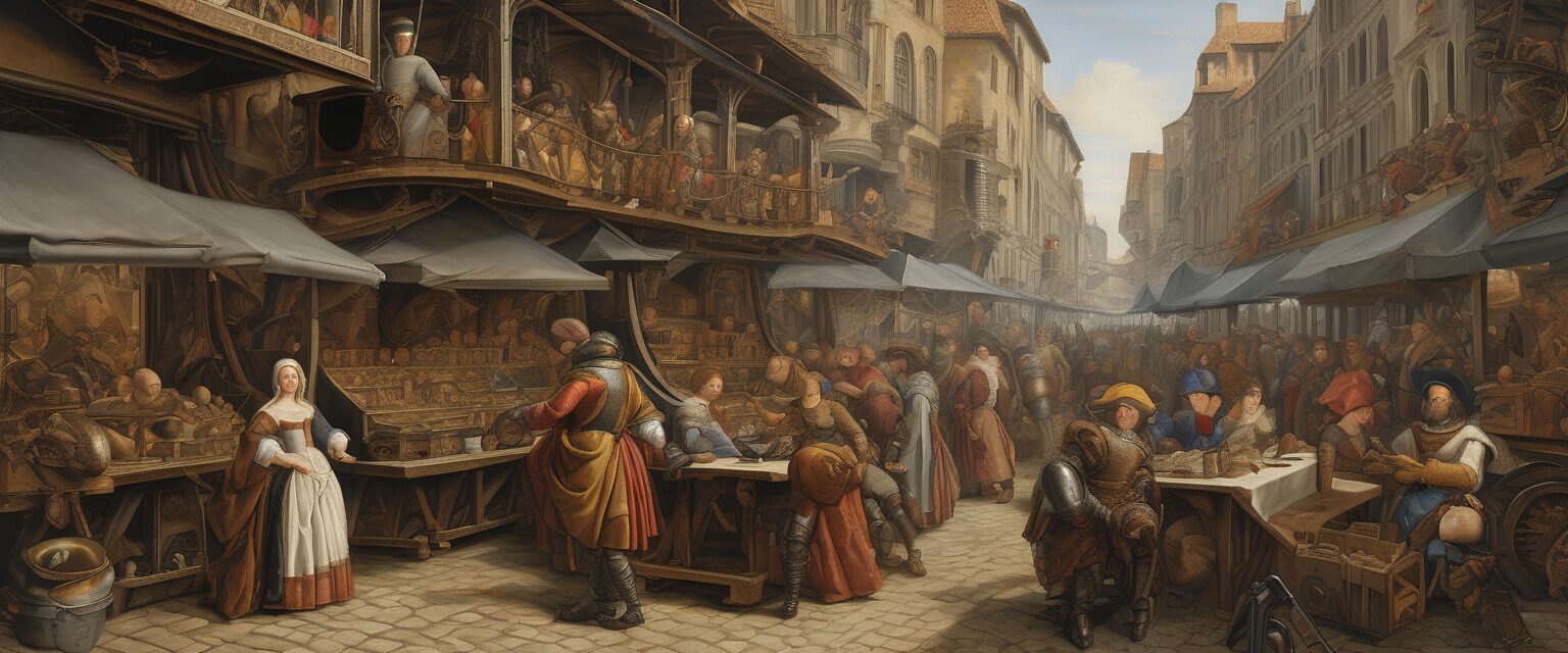 Una visión atrevida e imaginativa de una mezcla armoniosa de ciencia ficción y arte renacentista, presentando máquinas futuristas creadas en hierro rústico en un animado mercado del siglo XVI, un tributo al inexorable avance de la humanidad.