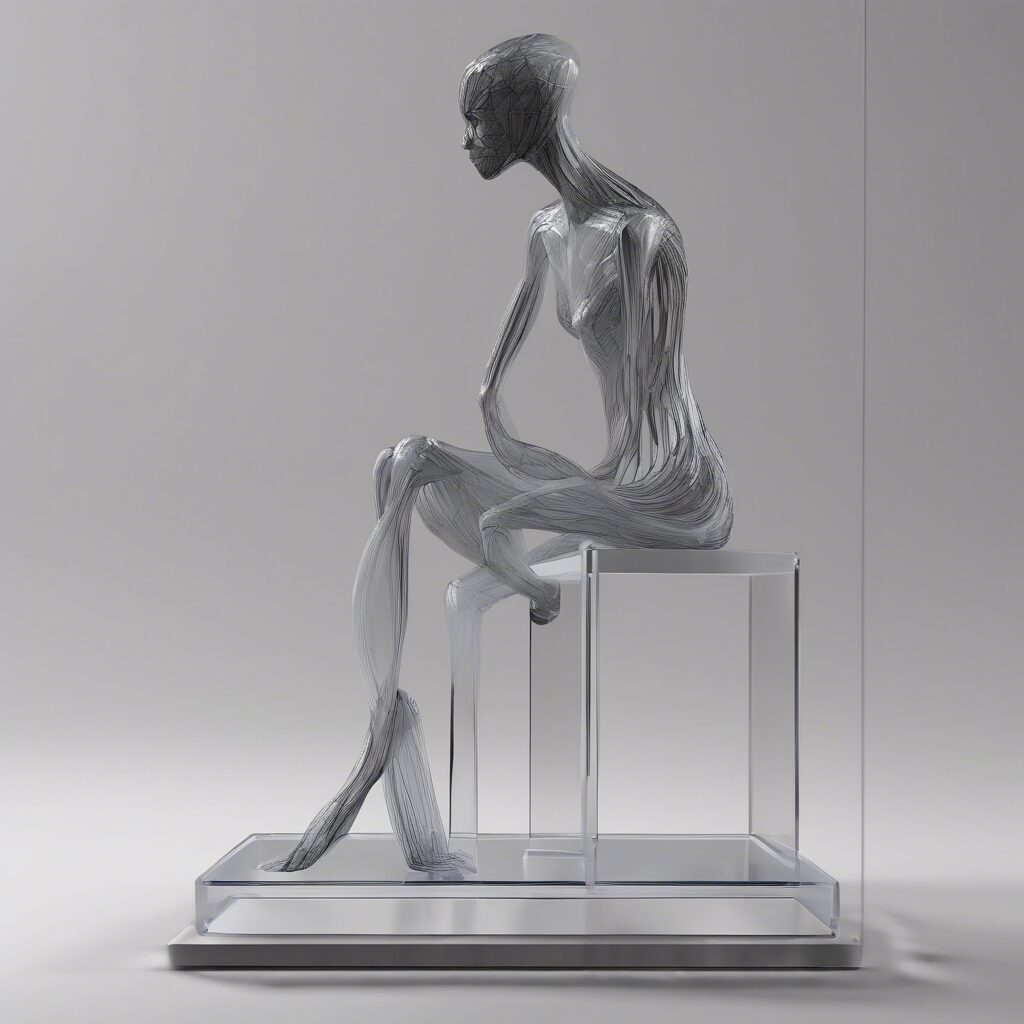 Crecimiento Helado, una interpretación digital tridimensional de la humanidad que se ramifica hacia la ternura de lo humano. Su minimalismo y formas orgánicas se desenvuelven en una danza refinada y sobria de colores pálidos y fríos, capturando la frágil resistencia del espíritu humano.