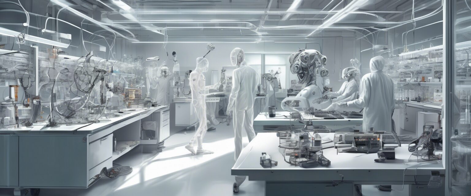 Figuras transhumanas exploran el mundo de la realidad aumentada y la realidad virtual en un laboratorio futurista, iluminado con luz de clave alta. Los avances y mejoras cibernéticas desdibujan los límites entre la física y el mundo digital en la era posthumana.