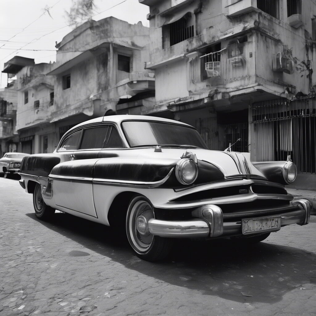 En medio de una escena atemporal, se encuentra un carro de diseño futurista que navega solitario por las calles de la añorada Venezuela, una metáfora de su resiliencia y lucha continua, una mirada nostálgica al pasado con un desafío silencioso al futuro en blanco y negro.