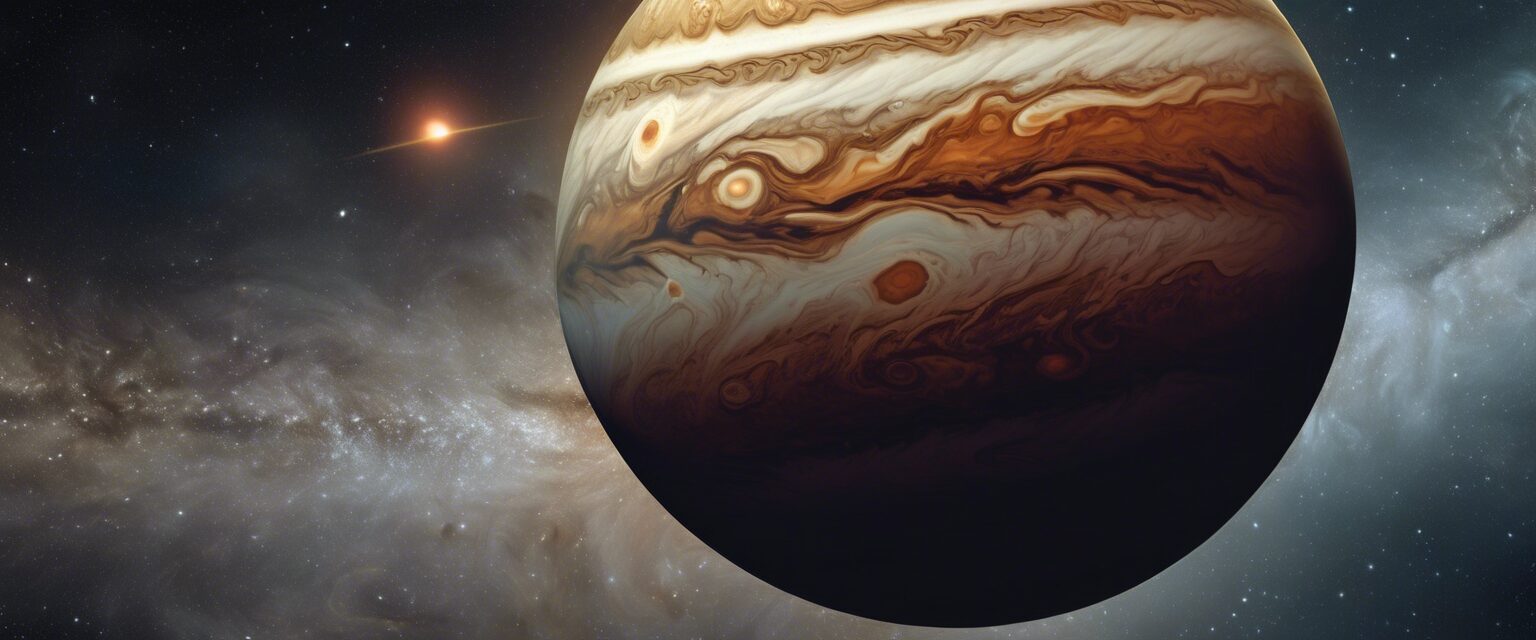 Júpiter, la clase de los gigantes gaseosos, se suspende majestuosamente en el vórtice del espacio profundo. Su tono naranja-tostado, las bandas de nubes y tormentas borrosas, y su Gran Mancha Roja, todo iluminado por la luz del sol lejano, ofrecen un cuadro soberbio de la intensidad del universo. A su alrededor, en una delicada danza espacial, flotan sus cuatro lunas más grandes. Todo esto resplandece contra un fondo de estrellas, brillando débilmente en la vastedad del cosmos.