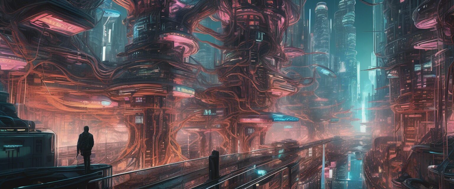 Una vista aérea de una megalópolis digital futurista, donde la brecha tecnológica separa a los cyborgs adinerados y a los transhumanos desfavorecidos. Los primeros son bañados por códigos binarios que caen como lluvia dorada, mientras que los últimos escarban en los desechos de datos erosionados para mejorar su vida.