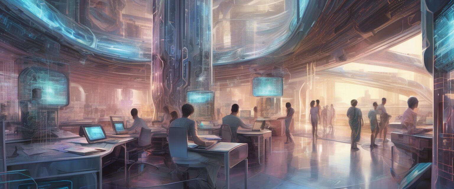 “Avatares lumínicos interactuando en un ciberespacio futurista, un testimonio visual de la fusión entre la educación digital y el aprendizaje en línea en un escenario posthumano, transhumano”.