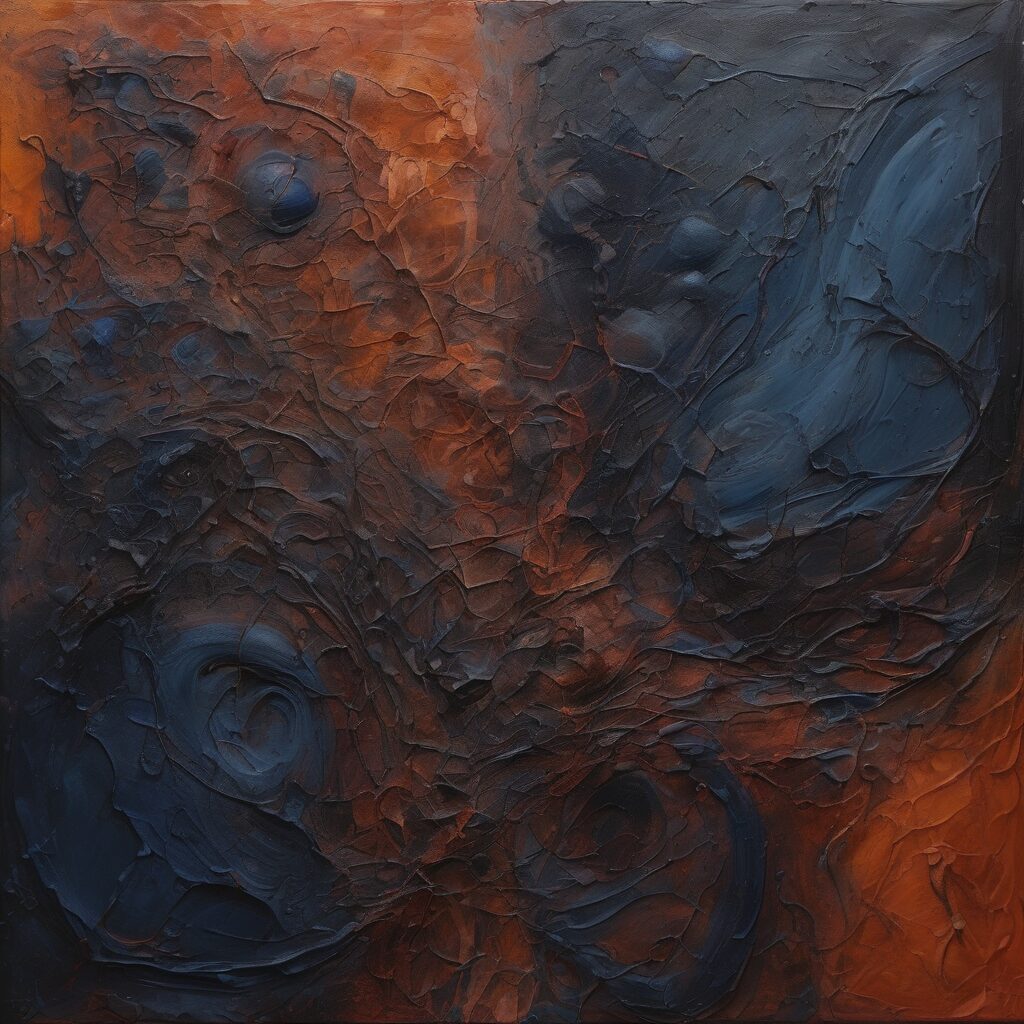 Un remolino de colores vibrantes que nacen desde una base oscura, resaltando los trazos y texturas firmes que se transforman en trazos más suaves y elegantes. Un testimonio de la vida, con todas sus luchas y triunfos, su desarrollo y su evolución.