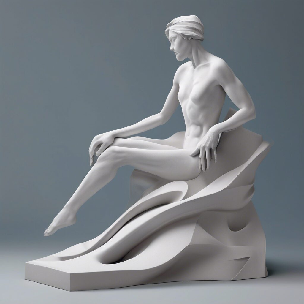 “Escultura minimalista en 3D que evoca la fortaleza y la elegancia de un héroe, representada a través de formas orgánicas y una paleta de colores fríos y claros.”