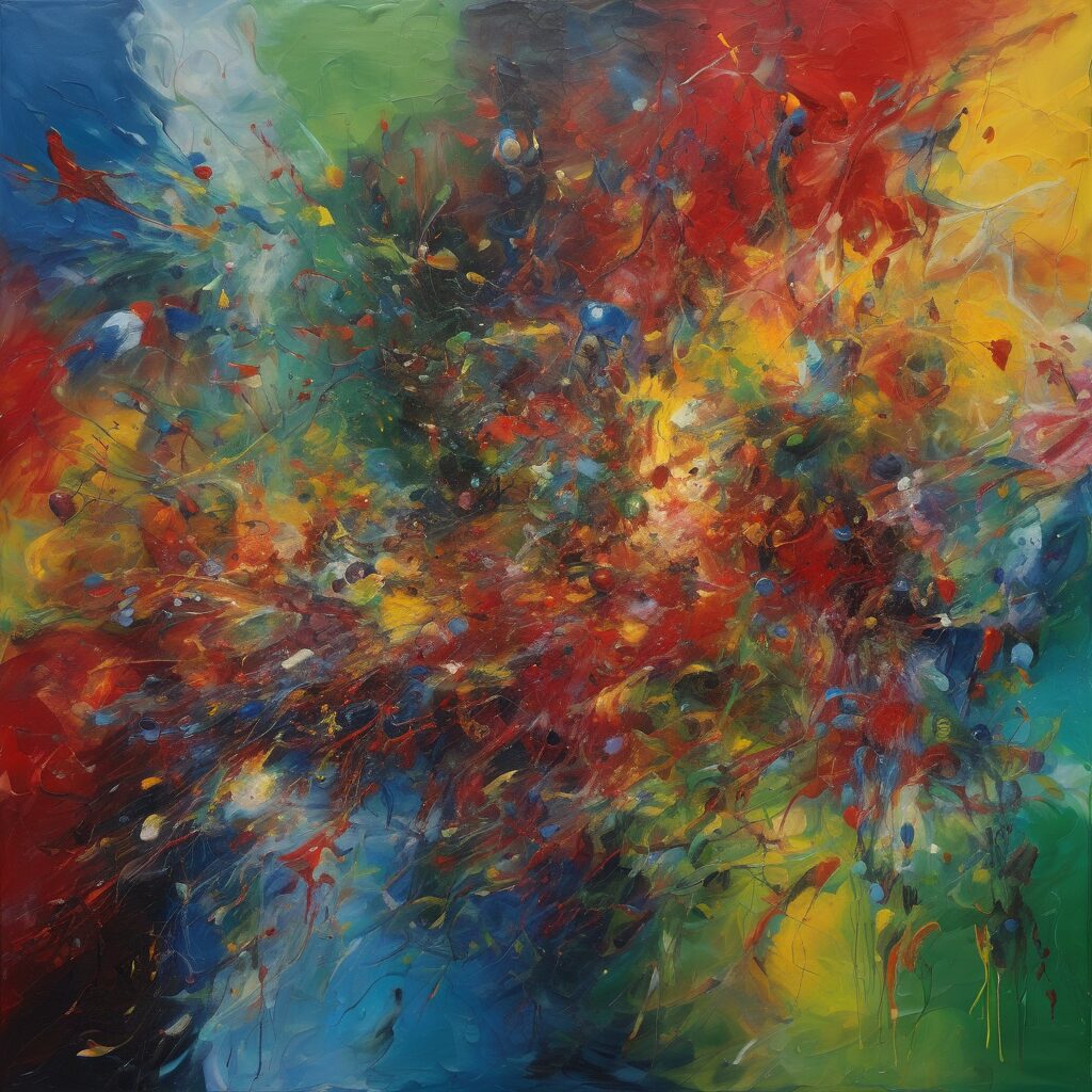 Un despliegue de colores vibrantes y trazos firmes que se entrelazan y se superponen en una danza abstracta, simbolizando la evolución y complejidad del ser transhumano.