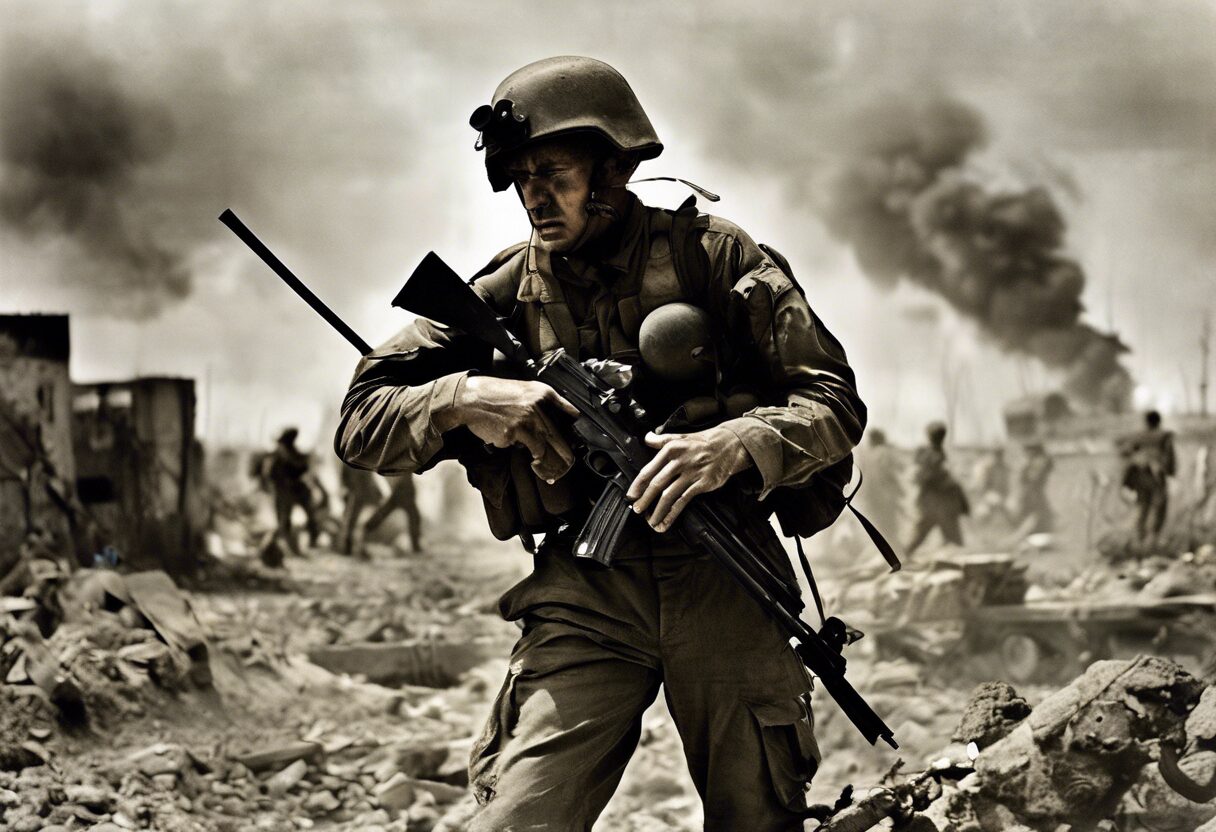 Imagen a color capturada con película analógica en un escenario de la Tercera Guerra Mundial. Muestra una ciudad en ruinas y un niño solitario con un osito de peluche, simbolizando la pérdida de la inocencia. La foto tiene grano moderado y colores parcialmente saturados, representando la dura realidad del conflicto y la pequeñas esperanza que persiste.