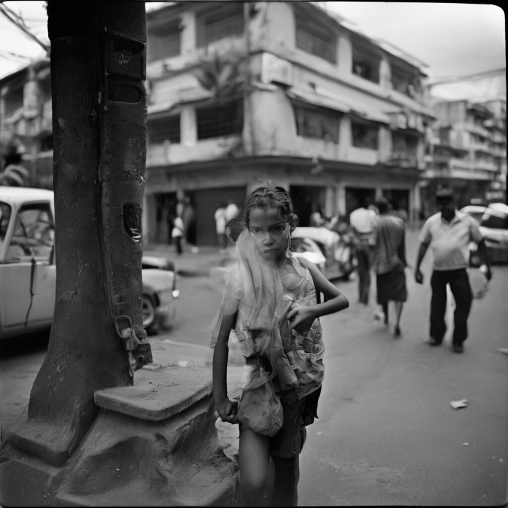 “En medio del paisaje urbano futurista, tres estadistas comparten un momento capturado en negativo de vidrio. El blanco y negro analógico realza la dicotomía de esperanza e incertidumbre en sus rostros, un reflejo de su lucha para adaptarse en una Venezuela en constante cambio y evolución.”