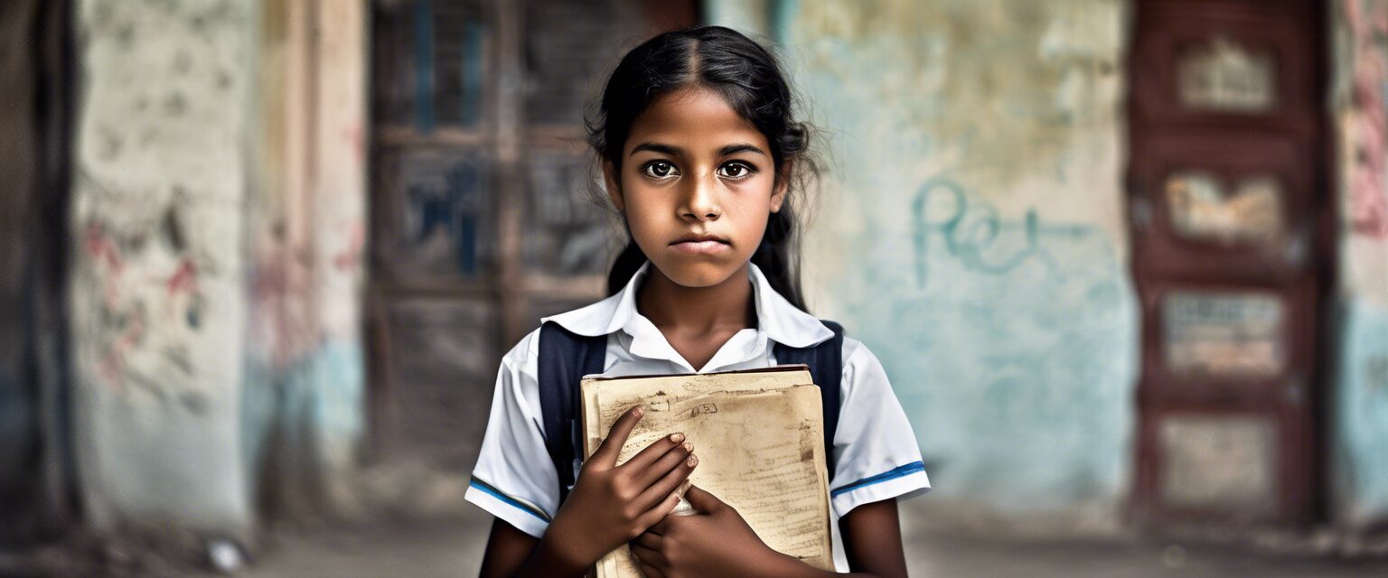 En un entorno desafiante, una valiente niña venezolana sostiene firmemente sus libros de texto desgastados frente a una escuela en ruinas. Un poderoso recordatorio de la lucha diaria y el espíritu resiliente de las personas frente al duro impacto social en Venezuela.
