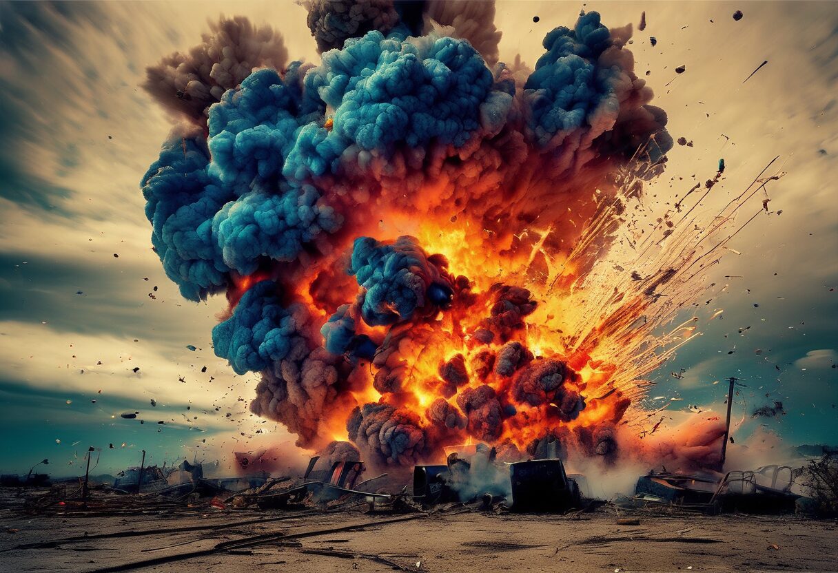 La fotografía captura de manera impresionante el poderoso estallido de una explosión: una contradicción de la destrucción humana representada en vibrantes colores. La técnica de película analógica con grano moderado añade una sensación de aspereza, igualando la crudeza de la escena, mientras que la saturación parcial del color destaca la paleta caótica de la explosión contra el sereno cielo azul. Este cuadro es un retrato inquietantemente bello del poder destructivo de la humanidad.