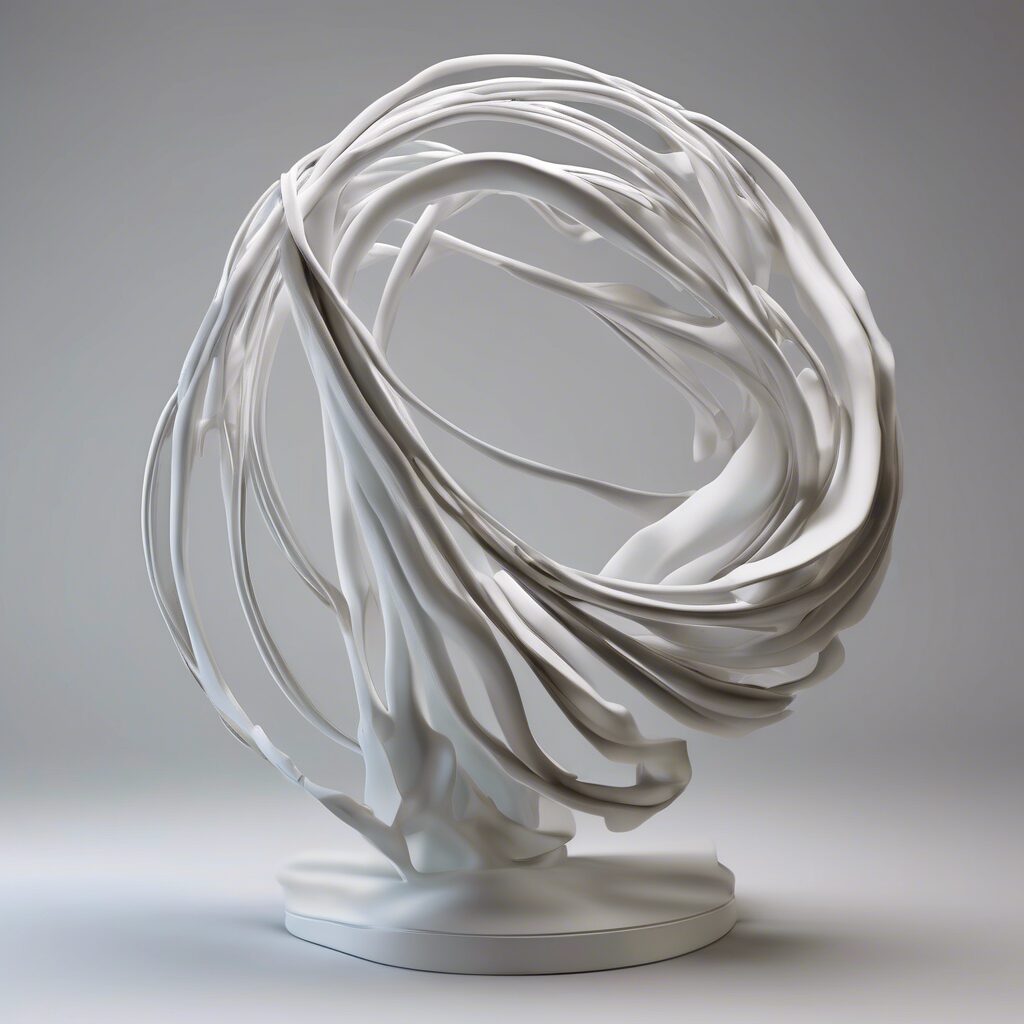 “Una escultura 3D representando la fluidez y adaptabilidad de la verdad en nuestra vida, dejando fluir la sinceridad y la honestidad en cada ángulo. Destaca la interacción entre luz y sombras, lo cual añade una profundidad única a esta encarnación de la verdad.”
