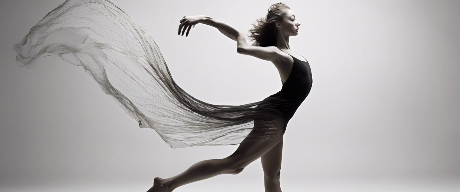 “Una bailarina de danza contemporánea se eleva en un espacio minimalista, conjugando graciosamente la fluidez de su movimiento con la rigidez del entorno. El choque sutil de colores vibrantes contra un fondo de tonalidades sedadas aporta un drama silencioso a esta escena, capturando la vibrante tensión y belleza de la danza en un momento etéreo.”