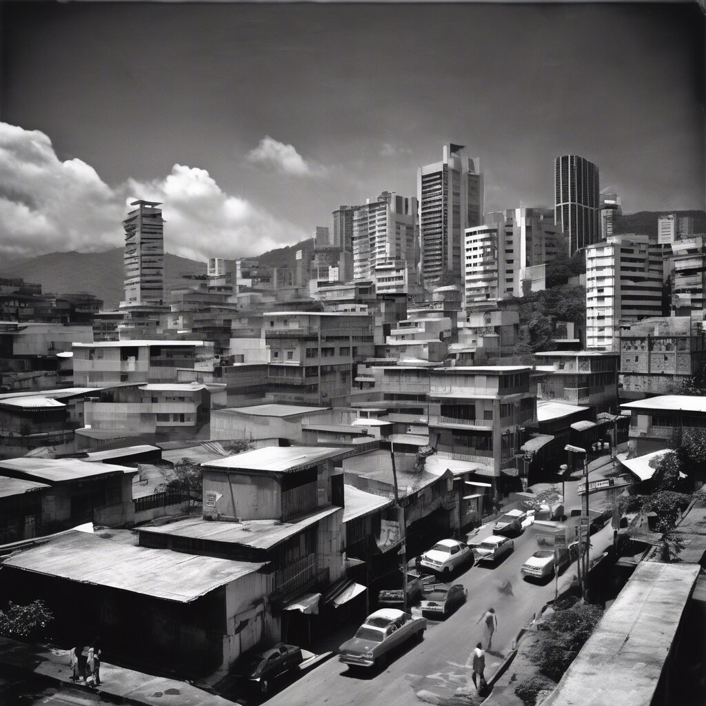 El progreso toma forma en el paisaje futurista de una Venezuela vibrante, capturando la sinergia entre el transporte innovador y la fuerza vital de su gente en un baile entre la tradición y el futuro.