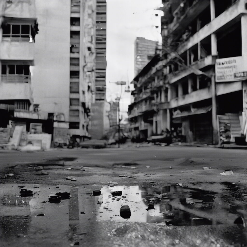 “Copia en blanco y negro impresa en vidrio de una escena futurista en Venezuela, mostrando un contrapunto entre la resistencia de la sociedad y la adopción de la tecnología.”