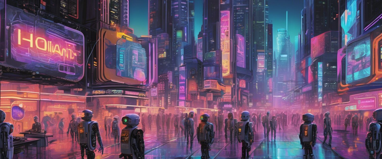 “El paisaje futurista de una ciudad poshumana, un crisol de luces de neón, robots humanoides, edificios inteligentes y drones zumbantes, donde la Gobernanza de Internet y Legislación Digital están dirigidas por la IA de ‘Código Profundo'”.