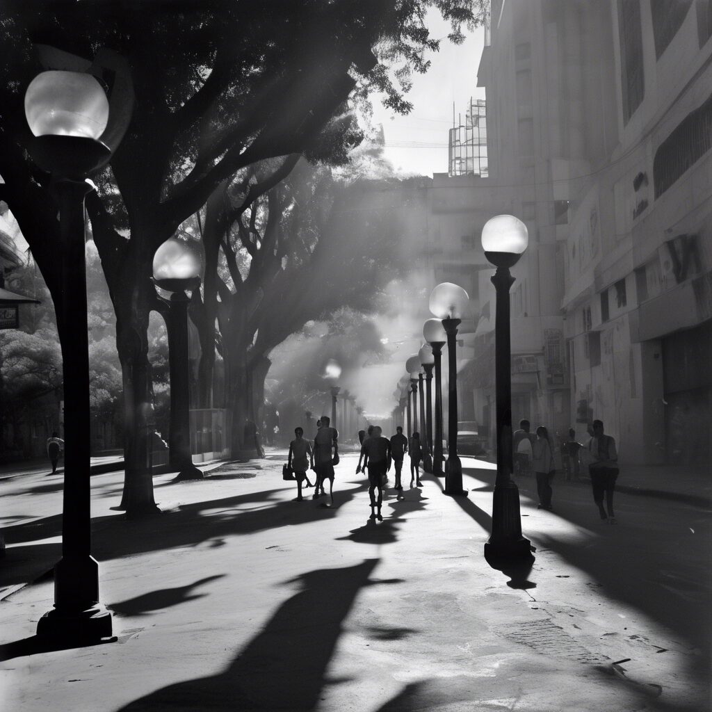 Un bus público venezolano de los años 60, reformado con tecnología futurista y decorado con emblemas nacionales, resplandece bajo la luz misteriosa de antiguos faroles y vallas publicitarias de holograma.