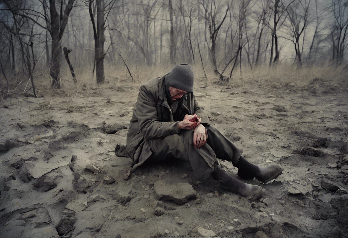 La fotografía de alta calidad y detalle obtenida muestra un paisaje desolado en tonos fríos, plagado de árboles esqueléticos y nubes amenazantes causados por los efectos de la radiación. La vida salvaje se ve en un estado débil y las marcas de la presencia humana, como edificaciones abandonadas, añaden un elemento sombrío de abandono al escenario. El impacto de la radiación en el paisaje, los animales y los seres humanos, es evidente en la desolada escena capturada por la lente.
