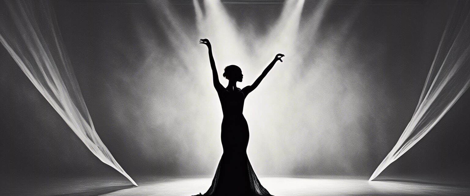 “Una bailarina solitaria eternizada en el acto de alcanzar la luz en un escenario sombrío. Su formación es una silueta humeante contra el fondo iluminado, un interludio silencioso entre el movimiento y la quietud.”
