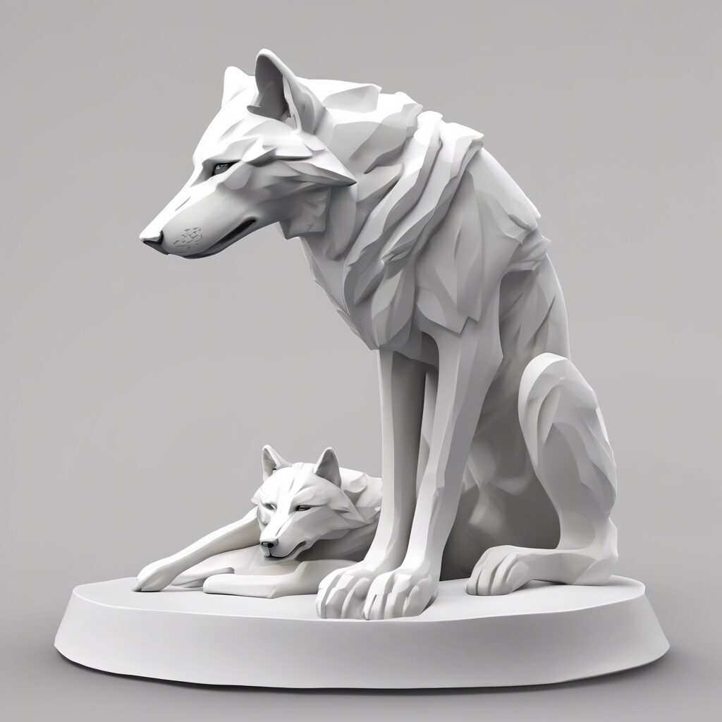 “Escultura minimalista y elegante que captura la esencia de la lealtad a través de lobos blancos entrelazados, expresando dependencia y confianza en una danza invernal de blancos y azules helados”.