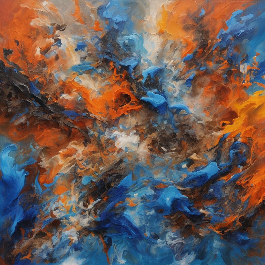 Un torbellino de azules audaces, naranjas ardientes y marrones terrosos sirve de fondo a esta vibrante representación del desarrollo evolutivo del ser. Las gruesas aplicaciones de pintura y los trazos intensos crean una sensación de transformación continua, simbolizando el surgimiento y crecimiento de la vida, y resonando con la evolución del espíritu humano. Las salpicaduras de oro y plata añaden chispas de iluminación y progreso a esta obra de arte abstracta inspiradora e inmersiva.