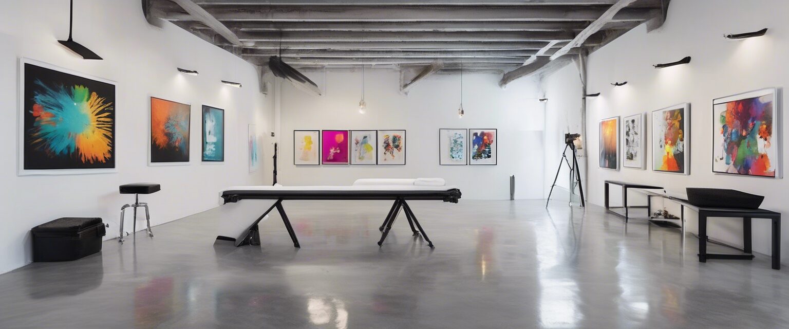 “Una mirada a un moderno estudio fotográfico, donde la creatividad y el comercio se encuentran en una sinfonía de estética minimalista y colores vibrantes.”