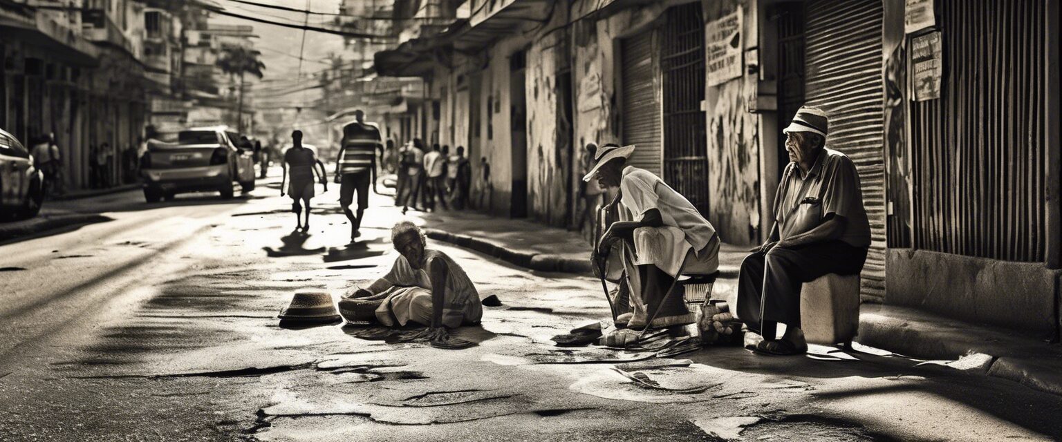 Un digno vendedor de arepas sobrevive en medio de las calles caóticas de Caracas, su rostro curtido nos recuerda la lucha diaria del venezolano y la resistencia tangible de su gente. El colorido fondo contrasta con su realidad, retratando la Venezuela real en su forma más cruda y auténtica.