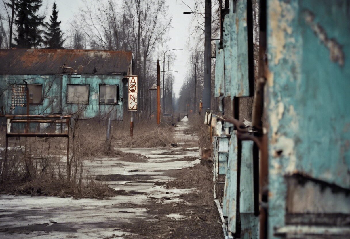 La fotografía captura las desoladas y vacías calles de Chernobyl, enfatizando el peligro invisible de la radiación que todavía persiste en la zona. El uso de colores fríos refuerza la sensación de soledad y desolación. Las señales de radiación, desgastadas y descoloridas, son tácitos recordatorios de la tragedia nuclear, sirviendo como símbolos de la arrogancia y el error humanos. A pesar de la severidad, la naturaleza comienza a reconquistar su espacio, ofreciendo un contraste visual con el metal de las señalizaciones y sugiriendo la capacidad de recuperación de la vida.