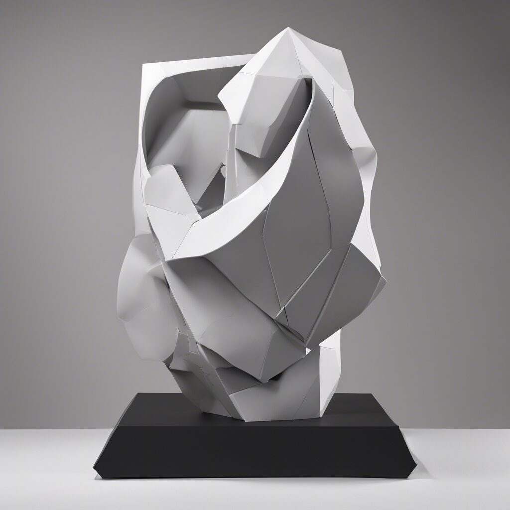 Escultura digital minimalista que capta la belleza fría y compleja de la tecnología. Geometría rígida entrelazada con formas orgánicas fluidas, bañada en tonos fríos y claros, creando una obra de arte que es un testimonio del mundo tecnológico en el que vivimos.