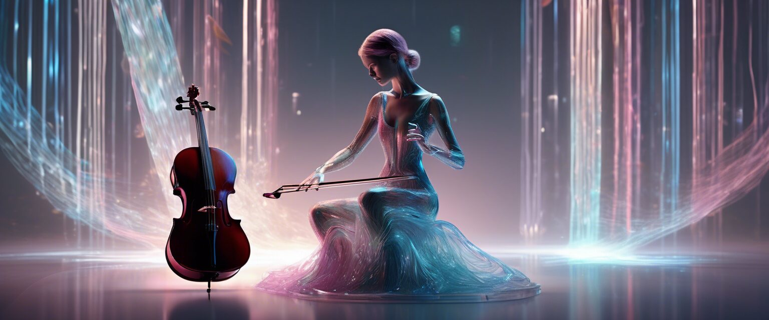 “Posthumana figura etérea toca un violonchelo holográfico en un escenario de realidad aumentada y virtual, donde los flujos de datos y luz danzan al ritmo de su sinfonía musical futurista.”