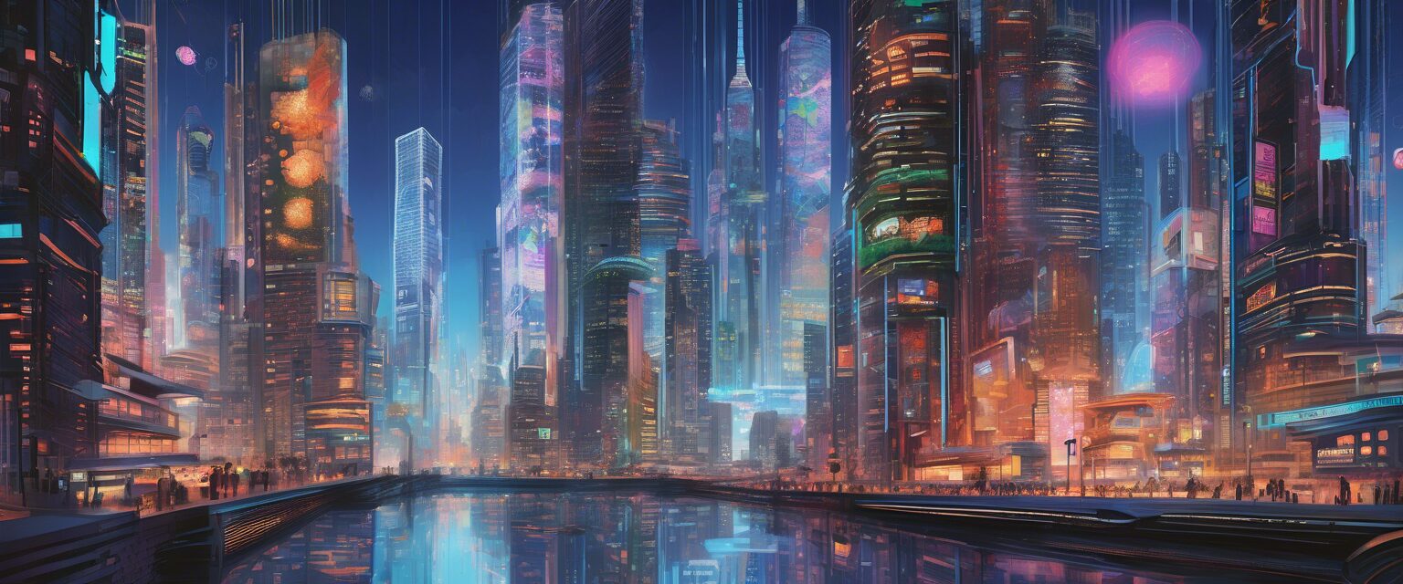En la futura metrópolis, la simbiosis humano-máquina abunda, con luces de neón que iluminan escenas de ciudadanos robóticos y ciborgs entre trenes y drones voladores. En la plaza principal, una gigantesca pantalla transmite relatos que muestran el impacto social de las tecnologías emergentes en la vida cotidiana.