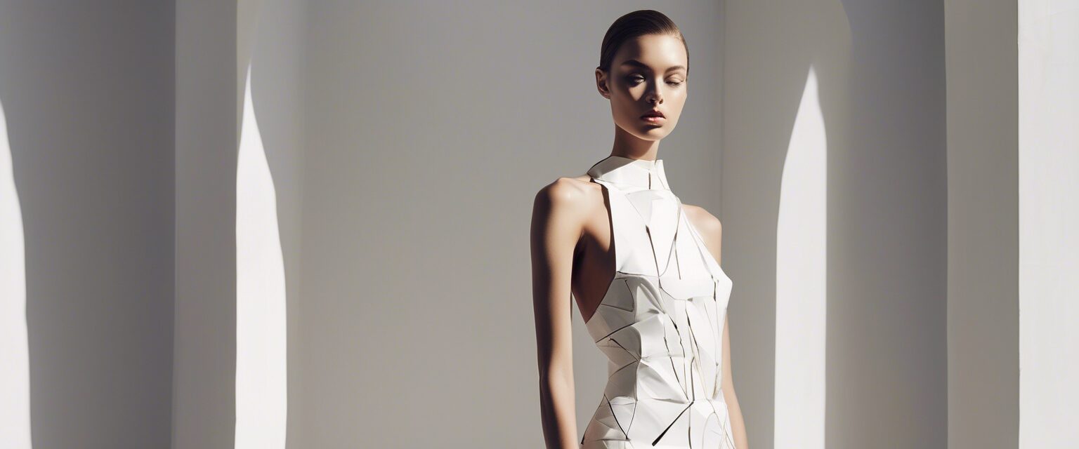 Nora, la confidente inmutable, en un juego entre la moda abstracta y el arte contemporáneo, proyectándose a sí misma en un espacio de luz y sombra. Su expresión perdida y su cuerpo en armonía con el blanco y negro del fondo pintan un cuadro de belleza y melancolía.