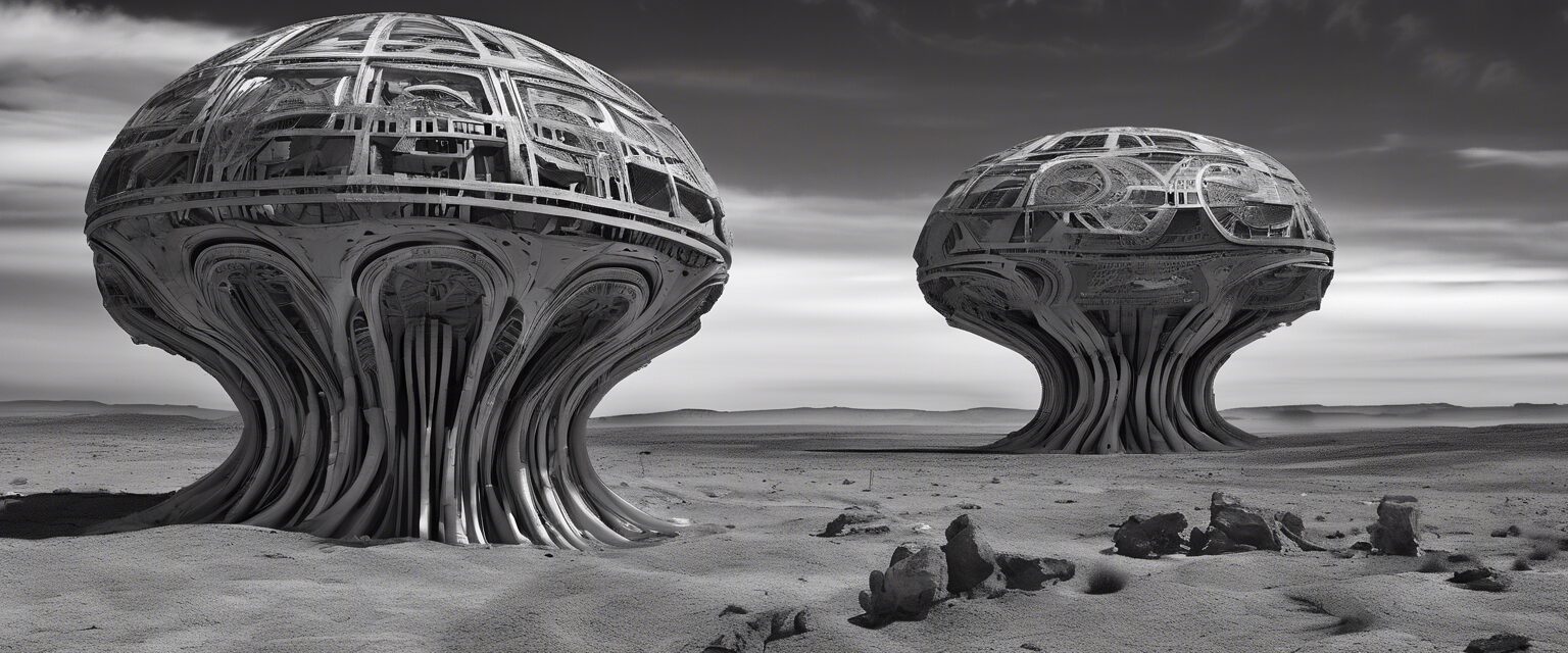 La imagen en blanco y negro de alta resolución “Postextraterrestre: Evolución Más Allá de lo Terrenal”, captura la idea de un ser que ha trascendido las barreras de lo terrestre y se sumerge en el reino de lo postextraterrestre. Diferentes contrastes de luz y sombra, y detalles minuciosos y enigmáticos, son habilidosamente utilizados para sugerir un escenario y una forma que desafían nuestras nociones usuales de paisaje y humanidad.
