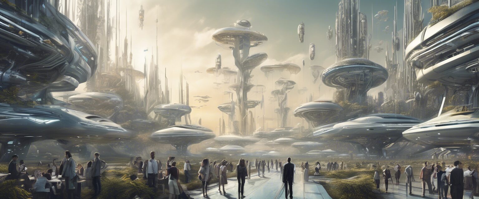 “Escena futurista de una metrópolis tecnológica, protagonizada por una entidad de IA interactuando con figuras humanas y transhumanas de la sociedad interconectada, subrayando la vitalidad de los derechos tecnológicos inclusivos y la ética de la IA.”