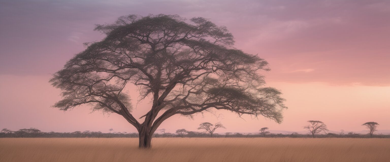 Un árbol solitario se alza contra el telón de fondo de un suave cielo de colores pastel en las vastas llanuras venezolanas, retratando una imagen de serenidad y contemplación pacífica.