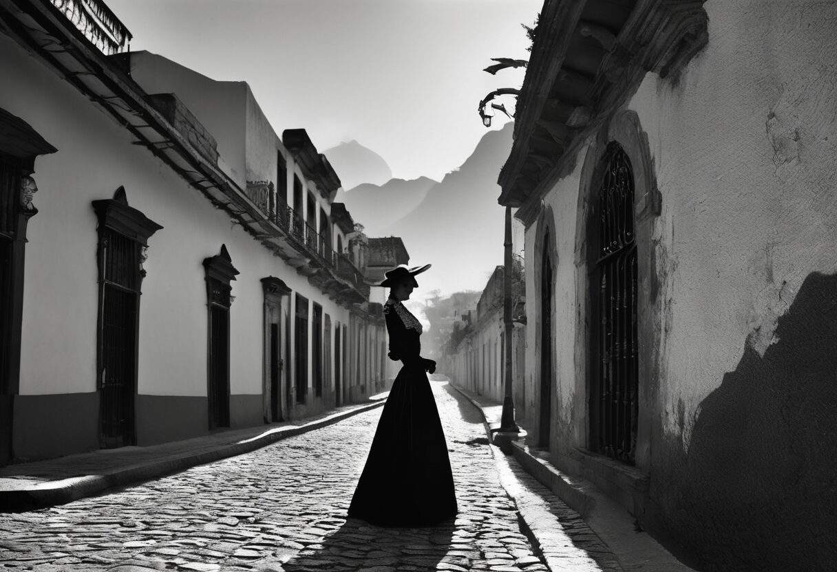 “Una elegante dama avanza por las calles adoquinadas de Caracas en la época colonial, su vestido bordado y su distintiva prenda de pelo capturan las tendencias de moda de finales del siglo XIX en Venezuela. Fotografía analógica tomada en película de 35 mm en blanco y negro”.