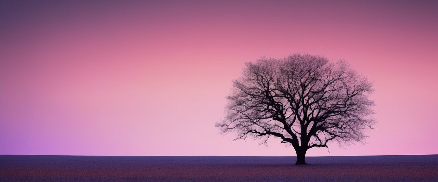 Las luces del atardecer cubren suavemente un árbol solitario, mientras la neblina matutina comienza a ocultar el frío suelo. Una expresión simbólica de soledad y serenidad en medio de la vastedad minimalista de la naturaleza.