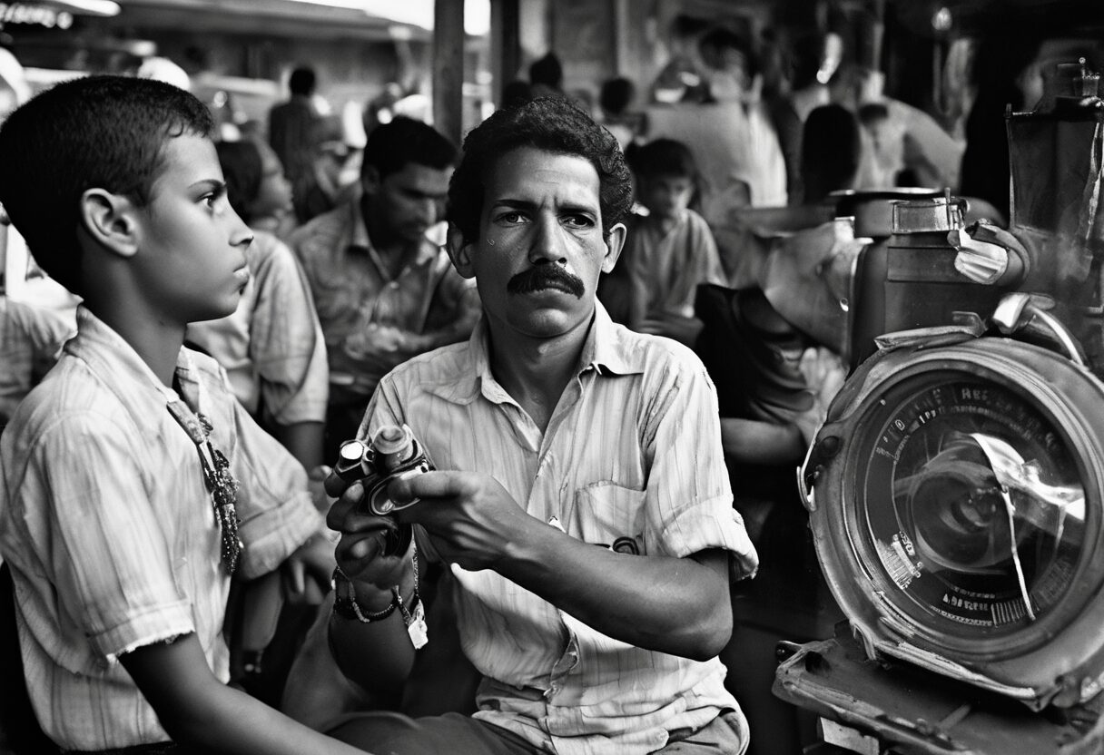 “En esta foto, capturada en película y convertida a blanco y negro, las tensiones políticas de finales del siglo XIX en Venezuela se hacen palpables. Las figuras autoritarias dominan la escena, mientras que el pueblo observa desde las sombras. Los rayos del sol tropical, intensos aún en la versión monocromática, pintan un lienzo de luz y oscuridad, una metáfora visual de la realidad política venezolana en aquella época”.