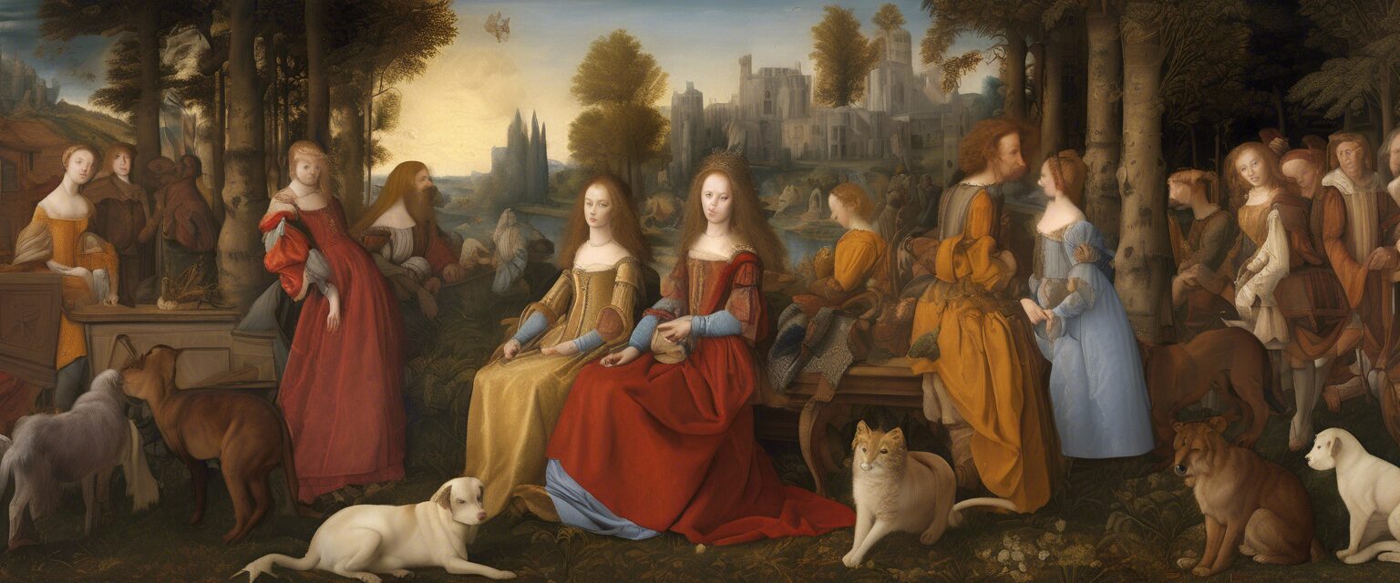 “Una pintura al óleo de textura delicada que captura una escena renacentista, ilustrando una sociedad en movimiento, en una transhumancia. La luz suave del atardecer y la técnica del sfumato dan vida a un paisaje dinámico y a gente que se desplaza, creando un hermoso juego de tonos cálidos y fríos.”