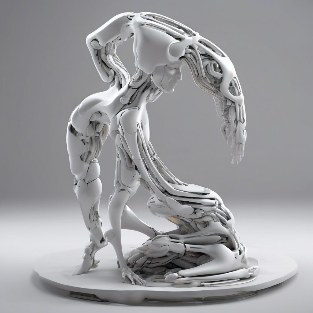 Elegantes formas orgánicas se entrelazan con lineamientos sintéticos en esta escultura minimalista, representando la convivencia de los humanos y los cyborgs en una paleta de colores fríos y claros.